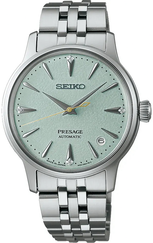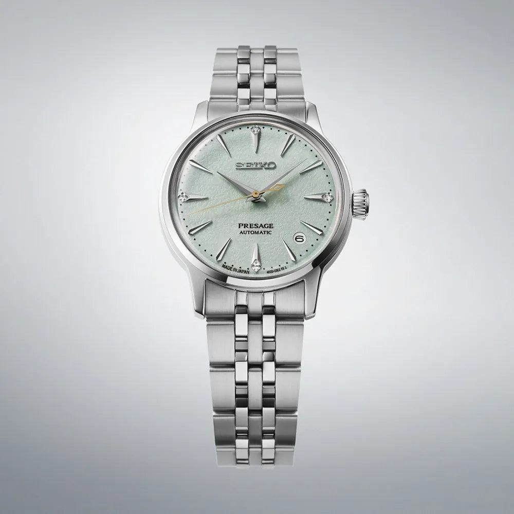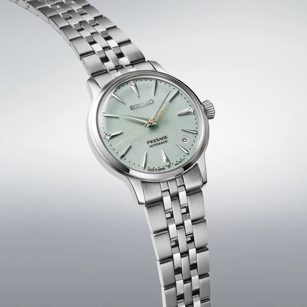 Ziehier een elegant mechanisch Seiko SRPL63J1 Presage Cocktail dameshorloge met 4 schitterende diamanten op de wijzerplaat en een unieke 'Frozen Mojito' wijzerplaat.