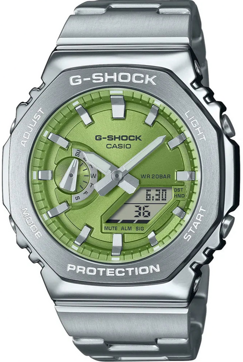 Maak kennis met de GM-2110D-3AER, een analoog-digitale combinatie van G-STEEL op basis van de GA-2100, nu met een stijlvolle update van de metalen rand en band.