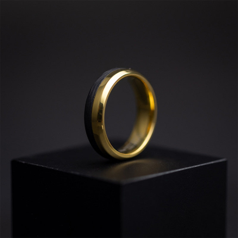 Vertel jou verhaal met deze zwart en goudkleurigeGemini ring AST03. Deze bestaat uit 2 lagen titanium en afgewerkt met een dun laagje gesmeed carbon.